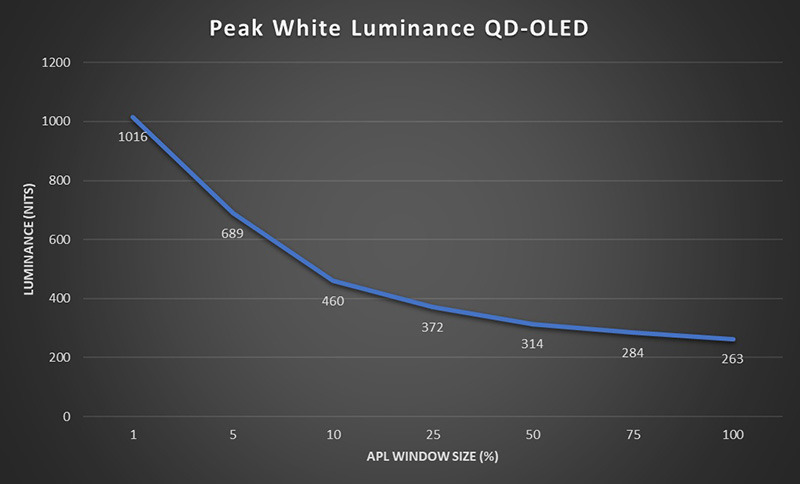 OLED의 경우 표시해야 하는 화면의 영역을 줄이면 줄일수록 휘도(밝기)가 늘어납니다. 그래서 화면 표시 영역이 1%에 달하면 약 9배에 달하는 피크 휘도를 달성할 수 있습니다. 이렇게 높은 피크 휘도를 달성할 수 있음에도 불구하고 많은 OLED 디스플레이들이 평균적으로 낮은 피크 휘도를 유지하고 있는 이유는 번인과 픽셀 노화를 예방하기 위해서입니다. 앞에서 말했듯이 번인은 영구적인 잔상입니다. 번인이 생겼다는 것은 패널 수명이 다했음을 의미하기도 합니다. 그래서 제조사들은 ABL이나 Pixel Refresh(Pixel Orbiter)를 통해 전력 소모를 줄여 번인과 픽셀 노화를 예방하고자 하지만, ABL의 경우에는 밝기를 제한하고 Pixel Refresh의 경우에는 화질이 제한되기 때문에 OLED를 사용하기에는 애로 사항이 많은 현재입니다.