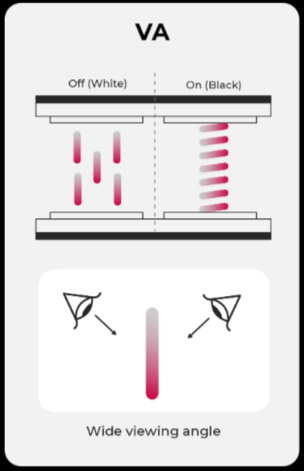 VA(Vertical Alignment) 패널은 높은 명암비가 특징입니다. 전압이 없는 상태에서 VA 패널의 액정 분자는 수직으로 배열되어 있습니다. 수직 배열은 빛이 통과하지 못하게 완전히 차단하여 선명한 블랙을 구현할 수 있습니다. 이런 방식으로 VA 패널은 3000:1의 높은 명암비를 구현해 냅니다. 명암비가 높아서 OTT 같은 영상을 시청할 용도라면 VA 패널이 좋은 대안이 될 수 있습니다. 이외에도 VA 패널은 적당한 시야각과 색상 영역, 가격을 가지고 있습니다. VA 패널은 IPS 패널보다는 좁지만 TN 패널보다는 넓은 시야각과 색상 영역을 가지고 있으면서 TN 패널보다는 비싸지만 IPS 패널보다는 저렴한 가격을 갖고 있습니다. 그런 이유로 예산이 넉넉지 못해 가성비를 중시하는 분들에게 VA 패널을 추천할 수 있겠습니다.