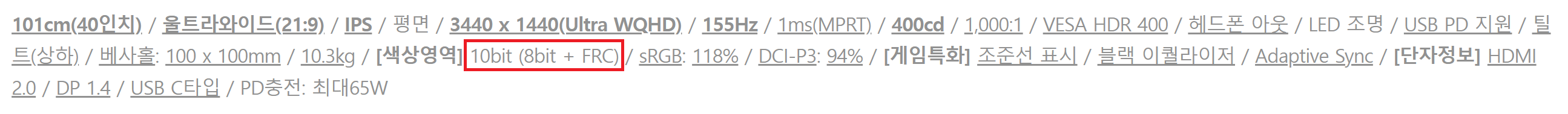 10bit가 기본이지만, 디스플레이의 스펙을 보시다 8bit + FRC라는 표현을 보신 적이 있으실 겁니다. FRC는 Frame Rate Control의 약자로, 가상의 10비트를 만들어 8비트 패널이 실제로는 표현할 수 없는 색상을 표현할 수 있도록 만들어주는 기술입니다. 온전한 10bit에 비해 화질이 열화 되고 물 빠진 색감이라는 말들이 종종 있지만 일반인은 그 차이를 느끼기는 쉽지 않습니다. 따라서 사용하는 데에는 큰 지장이 없습니다.