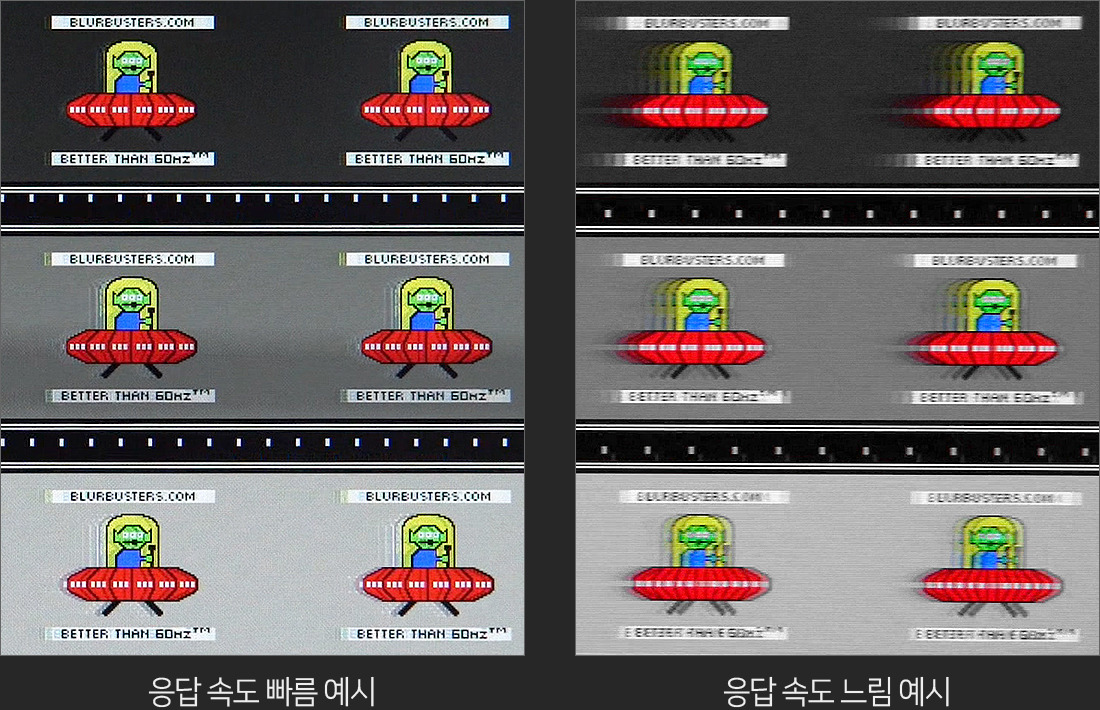 하지만 높은 주사율을 지원한다 하더라도 디스플레이의 응답 속도가 느리다면 화면을 새로고침 할 때 미세한 간극이 생기기 때문에 잔상이 두드러져 보일 수 있습니다. 그래서 높은 주사율을 구현하기 위해서는 높은 주사율과 빠른 응답 속도가 동기화되어야 합니다. 이제 응답 속도에 대해 알아보겠습니다.