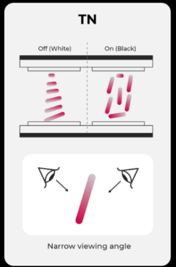 TN 패널의 가장 극단적인 단점은 좁은 시야각과 낮은 색상 영역, 명암비입니다. 액정 분자가 뒤틀려 있는 TN 패널의 구조상 액정 분자가 회전할 때, 모든 각도에 정확히 동일한 빛을 발산하도록 제어할 수 없기 때문에 빛이 제대로 통제되지 못합니다. 그런 이유로 시야각이 좁아지고, 색상 영역과 명암비가 왜곡됩니다. TN 패널의 시야각이 악명 높은 이유는 극단적인 각도에서 색상이 반전되어 보일 가능성을 가지고 있기 때문입니다. 근래에 출고되는 TN 패널 모니터의 경우에는 후드(Hood)라고 불리는 날개형 구조물을 양 옆에 배치해, 시야각 문제를 보완하려 노력하고 있습니다.