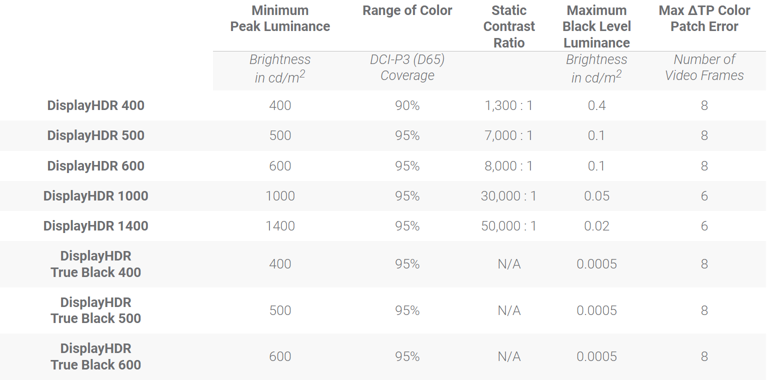 또한 VESA(Video Electonics Standards Association의 약자로 디스플레이 장치의 표준화를 추구하는 단체)는 우수한 밝기에 대해 표준화된 규격을 제시하고자 했습니다. 흔히 HDR 400, HDR 600이라 불리는 것이 그러한 규격입니다. 정식 명칭은 VESA Certified DisplayHDR입니다. VESA가 이러한 규격을 제시한 이유는 HDR10(HDR에 관한 개방형 표준) 인증 기준이 너무 낮아 제조사들이 수많은 디스플레이들을 무분별하게 인증하게 되면서 HDR10 인증이 HDR의 품질을 보증하지 못하게 되었기 때문입니다.